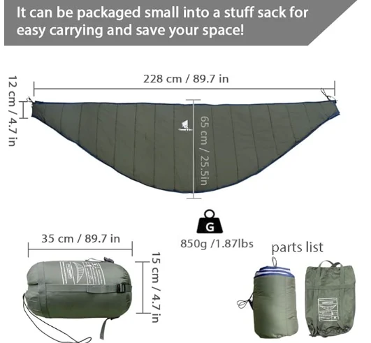 এই হামক কুইল্ট বেকপেকিঙৰ বাবে এটা কমপ্যাক্ট আকাৰলৈ পৰিণত হ'ব পাৰে, কেম্পিং, হাইকিং, ভ্ৰমণৰ বাবে মহান