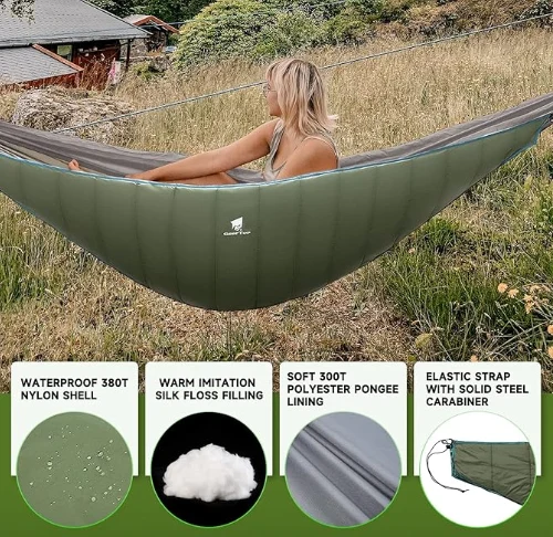 3 - 4 ঋতু Hammock quilt 41°F ৰ পৰা 68°F লৈকে উষ্ণতাৰ বাবে আদৰ্শ; ইয়াক এটা হামকোক ওলোমাই থোৱাৰ বাবে নিখুঁতভাৱে আকৃতি দিয়া হয়, যিয়ে আপোনাক বতাহৰ পৰা ৰক্ষা কৰে আৰু আপোনাক উষ্ণভাৱে কুঁৱলী কৰি ৰাখে।